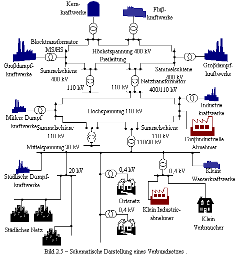 Das heutige europäische Drehstrom-Verbundnetz umfasst Übertragungs- und Verteilungsleitungem mit verschiedene Spannungsebenen (Bild 2.5):