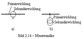 Bei Stromwandler (Bild 2.14 a)) wird die Primärwicklung vom Betriebsstrom durchflossen, bei Spannungswandler (Bild 2.14 b)) liegt die Primärwicklung direkt an der Betriebsspannung. Die Spannung bzw der Strom der Sekundärwicklung ist dem primärseitigen Betriebswerte proportional.