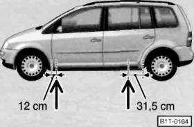 TOURAN: Der Abstand der Aufnahmepunkte zum vorderen Radlauf betr gt 12 cm, zum hinteren Radlauf 31,5 cm.