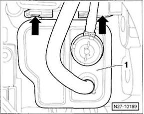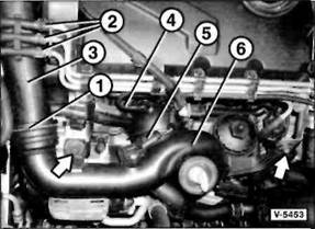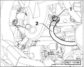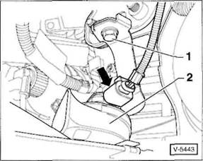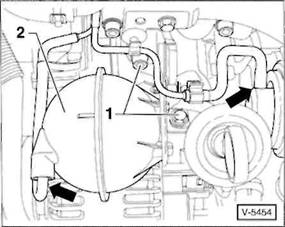 Turbodieselmotor AZV/BKD: Unterdruckschl uche -Pfeile- abziehen. Schrauben -1- herausdrehen und Unterdruckbeh lter -2- herausnehmen.