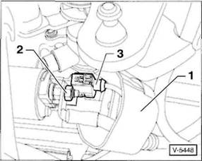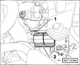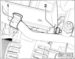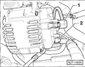 Mutter -1- abschrauben und Kabelhalterung -2- von der oberen Befestigungsschraube des Anlassers abnehmen.