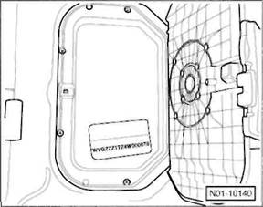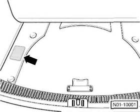GOLF: Die Fahrzeug-Identifizierungsnummer befindet sich auch auf dem Fahrzeugdatentr ger -Pfeil-, der links in der Reserveradmulde aufgeklebt ist.