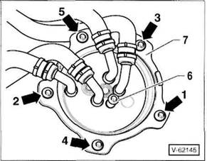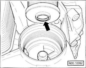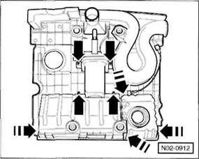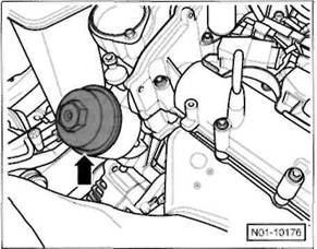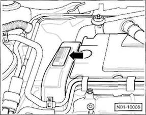Die Kennbuchstaben des Motors und die Motornummer befinden sich auf einem Aufkleber an der Zahnriemen-Abdeckung -Pfeil-. Hinweis: Um sie einzusehen, beim Benzinmotor gegebenenfalls obere Motorabdeckung ausbauen, siehe Seite 178.