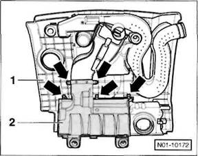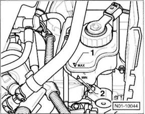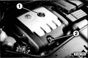 GOLF: Die Fahrzeug-Identifizierungsnummer -Pfeil- ist ebenfalls im Motorraum auf der Verl ngerung des rechten L ngstr gers eingeschlagen. Zum Ablesen muss das D mmgummi -1- abgenommen werden. 2 - K hlmittelausgleichbeh lter.