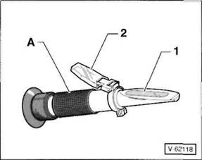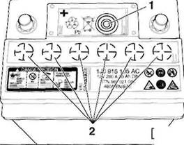 Achtung: Bei einer Batterie ohne Zellverschlussstopfen wird der Ladezustand und S urestand auf die gleiche Weise gepr ft, wie bei einer Batterie mit Zellverschlussstopfen. Allerdings muss die Batterie bei zu niedrigem S urestand, das magische Auge -1- ist dann gelb oder farblos, ersetzt werden.