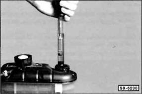 Hinweis: Die Fachwerkstatt verwendet zum Nachf llen die Batterie-F llflasche VAS-5045. Die Bauart des Einf llstutzens der VW-F llflasche verhindert ein berf llen der Batteriezelle und das Austreten von Batteries ure. Bei Erreichen des maximalen F llstandes wird der Zufluss von destilliertem Wasser in die Batteriezelle automatisch unterbrochen.