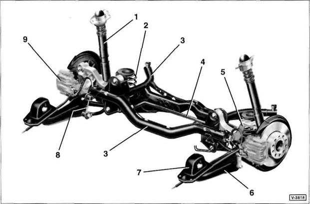 Der Hilfsrahmen, eine geschwei te Stahlkonstruktion, ist starr mit der Karosserie verschraubt. Die Querlenker sind zum Teil aus Aluminium gefertigt. Die L ngslenker sind ber Gummimetalllager mit dem Aufbau verschraubt.