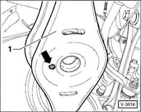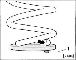 Gespannte Schraubenfeder zusammen mit der unteren Federauflage einsetzen. Dabei muss der Zapfen der Federauflage in die Bohrung -Pfeil- im Querlenker -1- eingesetzt werden.