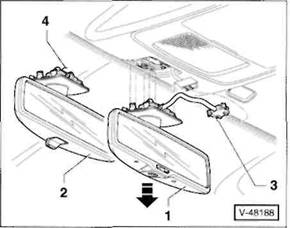 Spiegel -1/2- mit Spiegelfu kr ftig nach unten ziehen -Pfeil- und aus der Halterung im Dachhimmel ausrasten. 2 - Spiegel ohne Regensensor, 4 - Montagefeder.
