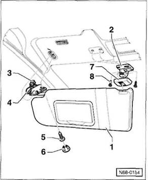 Abdeckkappe -7- abhebein, Schrauben -8- herausdrehen und Sonnenblendenlager -2- vom Dachhimmel abnehmen.