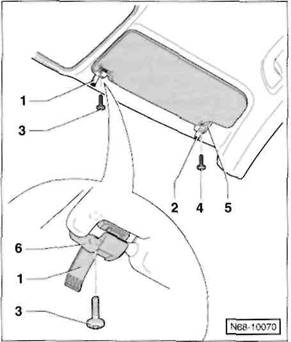 Schrauben -3/4- herausdrehen und Sonnenblendenlager -5- an der Au enseite vorsichtig aus der Aufnahme herausziehen.