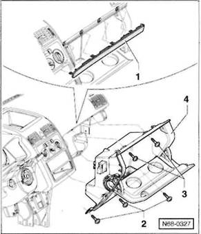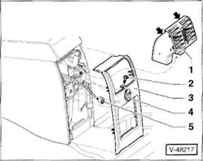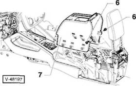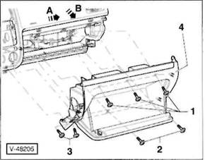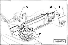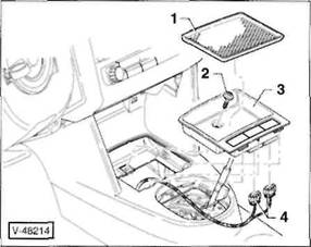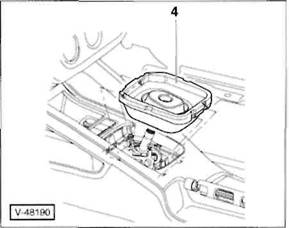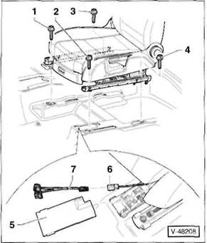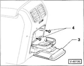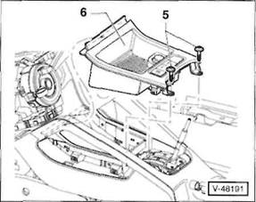 2 Schrauben -5- herausdrehen, vorderes Ablagetach -6- aus der Mittelkonsole herausziehen und Stecker an der R ckseite von den Schaltern abziehen. Hinweis: Je nach Ausstattung ist anstelle des Ablagefachs ein Aschenbecher in der vorderen Mittelkonsole eingesetzt.