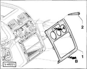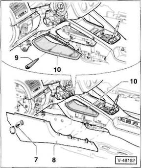 Mit einem Kunststoffkeil -9- Blende -10- links und rechts an den Einrastungen ausclipsen und von der vorderen Mittelkonsole abnehmen.