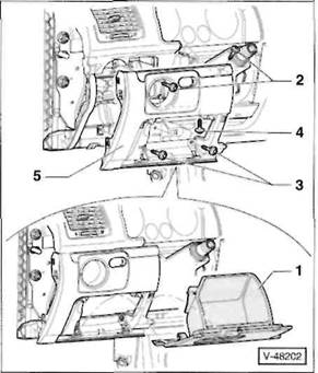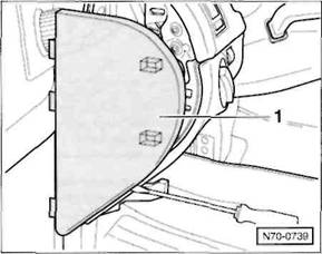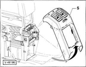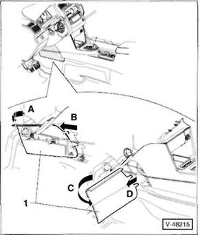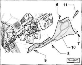 Mit einem Schraubendreher Abdeckkappe aus der seitlichen Verkleidung heraushebeln, Schraube -7- herausdrehen, linke Verkleidung -8- aus den Aufnahmen der Mittelkonsole herausziehen und abnehmen.