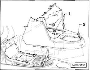 Mit einem Kunststoffkeil Abdeckung -1- f r W hlhebel aus der Mittelkonsole ausclipsen und Faltenbalg nach oben ber den W hlhebel st lpen.