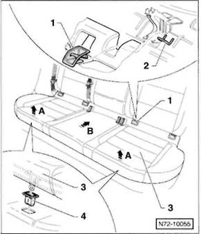 4 F hrungen -1- aus den Verankerungen -2- f r Kindersitze ausclipsen.