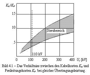 Kabelkosten sind immer grösser als Freileitungskosten für gleiche Übertragungsleistung und gleiche Länge. Die Wahl einer Lösung für Versorgung eines Verbrauchers braucht grundsätzliche wirtschafliche Überlegungen. Bild 3.1 zeigt die Kostenrelation zwischen Kabel- und Freileitungskosten.