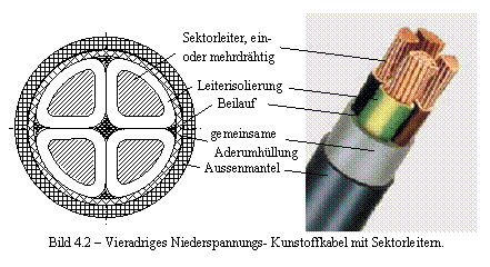 Bild 3.2 zeigt den Aufbau eines Vierleiterkabels für Drehstrom-Niederspannungsnetze. Die Leiter (Kabeladern) bestehen aus Kupfer oder aus Aluminium und sind sektorförmig oder Rund. Der Leiter kann ein- oder mehrdrähtig sein.