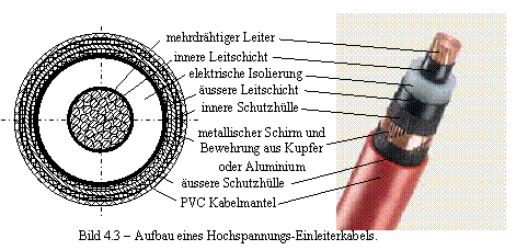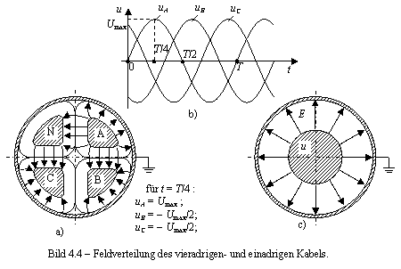 Mittel- und Hochspannungskabel (Bild 4.3) werden meistens als Einleiterkabel ausgeführt um eine elektrisch günstiger Belastung der Isolierung zu bekommen. Bild 4.4 zeigt eine elektrische Feldverteilung bei vieradrigen Kabel (Bild 4.4 a)) im Moment t = T/4 (Bild 4.4 b)) und eine elektrische radiale Feldverteileung bei einadrigen Kabel (Bild 4.4 c)). Die Feldverteilung bei vieradrigen Kabel (Bild 4.4 a)) ist verschiedene im jedem Moment, was bedeutet verschiedene und ungünstige elektrische Belastungen. Die Feldverteileung bei einadrigem Kabel (Bild 4.4 c)) ist immer radial und erlaubt eine bessere Bemessung der Isolierung. Die radiale Feldverteilung erzielt man durch konzentrische metalleinlagen aus Metallfolie, aus metaliesiertem Papier oder aus anderen Leitmaterialien.
