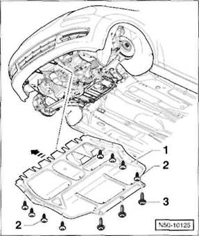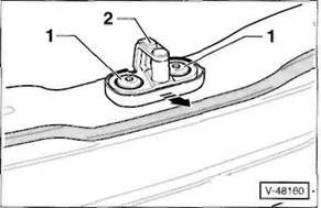 Motorraumabdeckung -1- nach hinten herausziehen und abnehmen. Hinweis: Der Pfeil zeigt in Fahrtrichtung.