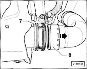 Turbodiesel mit Ladeluftk hler: Steckkupplungen 7-entriegeln und Druckschl uche -8- vom Ladeluftk hler abziehen -Pfeil-.
