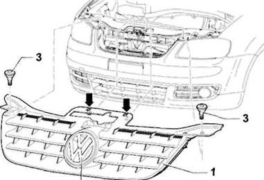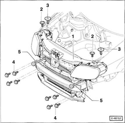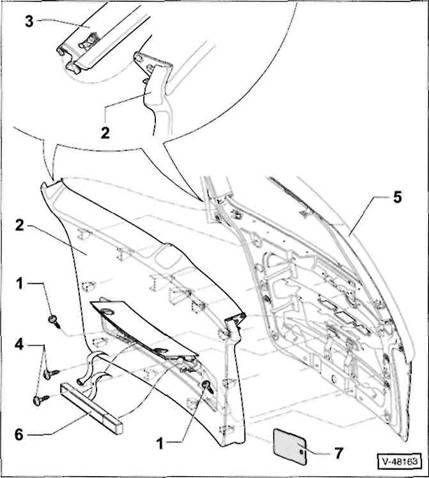 Windlaufgrill vorsichtig nach oben aus der Aufnahme -5- herausziehen. Dabei auf der rechten Seite beginnen. Achtung: Windlaufgrill nicht mit einem Kunststoffkeil von der Frontscheibe -2- abhebein.
