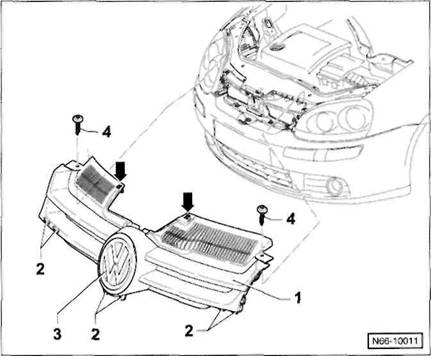Windlaufgrill vorsichtig nach oben aus der Aufnahme -5- herausziehen. Dabei auf der rechten Seite beginnen. Achtung: Windlaufgrill nicht mit einem Kunststoffkeil von der Frontscheibe -3- abhebein.