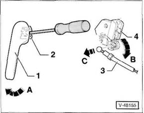 Abstandsring -2- in Pfeilrichtung schieben, dadurch wird die Sicherungsklammer entriegelt. Gleichzeitig Fensterkurbel -1- vom Antrieb abziehen.