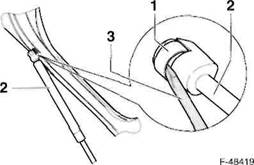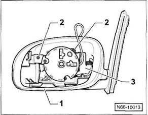 Beide Anschlusskabel -3- f r elektrisch beheizbaren Au enspiegel von der Spiegelglas-R ckseite abziehen. Dabei die angenieteten Kontaktzungen festhalten, um Besch digungen zu vermeiden.