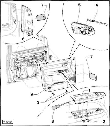 Mit einem Schraubendreher -8-oder einem Kunststoffkeil Griffschale -1- nach oben aus der Verkleidung heraushebeln.