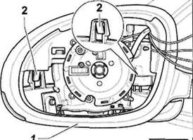 3 Schrauben -2- herausdrehen und Spiegel -1- mit Spiegeltr ger abnehmen.
