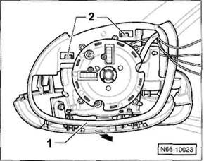Mit einem Schraubendreher Rasthaken -2- am Spiegeltr ger entriegeln und Spiegelblende -1- nach hinten -Pfeil- abziehen.