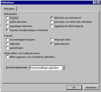 Hieronder zul je de mogelijkheden voor het afdrukken in Word te zien krijgen en vervolgens een uitleg hoe je dat voor elkaar krijgt.
