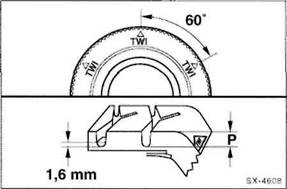 dicator) oder Dreiecksymbole die Lage der Verschlei anzeiger. Die Fl chen der Abnutzungsindikatoren haben eine H he von 1.6 mm. Sie d rfen nicht in die Messung mit einbezogen werden. F r die Messwerte entscheidend ist das Ma an der Stelle mit der geringsten Profiltiefe -P-.