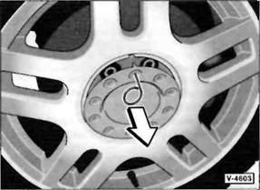 Fahrzeuge mit Mittenabdeckung: Mittenabdeckung einsetzen und einrasten lassen. Dabei darauf achten, dass die Nase an der Abdeckung in die Aussparung in der Felge eingreift, siehe Abbildung V-4603.