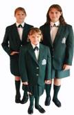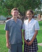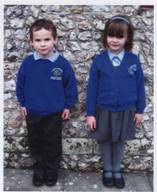 ) Junge hat an blaue Hemde, blaue Pulli und schwarze Hose an. Mädchen hat an blaue Hemde, blaue Pulli und graue Rocke an.