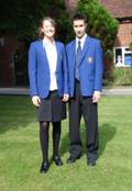 5)Auf dem bild ist zwei Leute. Mädchen hat an blaue Jacke, weiße Hemde und schwarze Rocke an. Junge hat blaue Jacke, weiße Hemde, streifte Krawatte und schwarze Hosen.