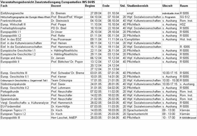 Diese oder ähnliche Fragen werden Sie seit geraumer Zeit beschäftigen. Wir von der Koordinierungsstelle des Zusatzstudiengangs Europastudien möchten Ihnen bei der Lösung dieser Fragen helfen und Ihnen den Einstieg in Ihr neues Studienprogramm erleichtern. Deshalb bieten wir in der Woche vom 27.09. bis 01.10. eine Einführung in das Europastudium an. In Kleingruppen wollen wir Sie in das Studienprogramm einführen und einen Stundenplan erstellen, der auf Ihre Bedürfnisse abgestimmt ist. Außerdem werden Sie erste Studienbekanntschaften schließen und sich leichter orientieren können. Höhepunkt der Einführungswoche wird ein Treffen aller Erstsemester mit dem Leiter des Studiengangs, Professor Heinen, und dem Vorsitzenden des Prüfungsausschusses, Professor Noethlichs, sein.