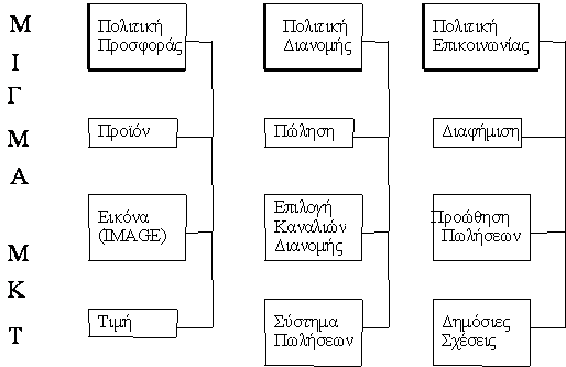 Η κατανομή των συστατικών στοιχείων του μίγματος Μάρκετινγκ του E. J. Mc CARTHY σε 4 ομάδες (τα 4 'P') έχει διεθνώς επικρατήσει. Αυτά είναι: