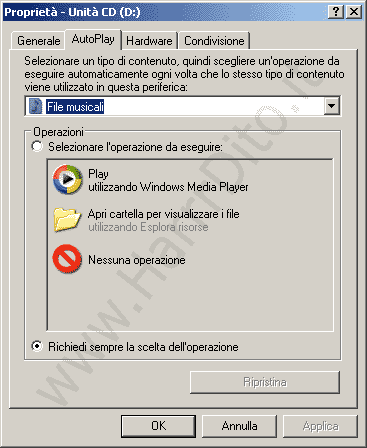 In Windows XP non č necessario agire sul registro di configurazione per disabilitare l'autoplay dei CD-Rom... Basta andare su