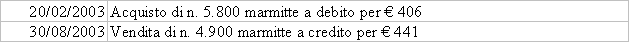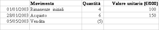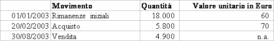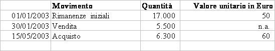 Le rimanenze al 31/12/2003 sono pari a 17.800 pezzi che a FIFO ammontano a (6.300 x 60 + 11.500 x 50 ) euro 953.
