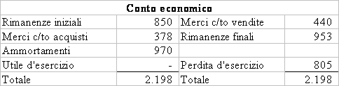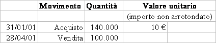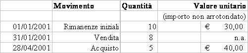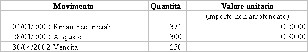 Le rimanenze al 31/12/2001 sono pari a 40.000 pezzi che, al costo medio unitario di € 10, ammontano a € 400.000.