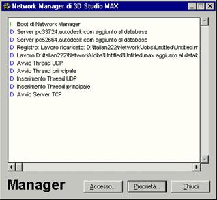 Per prima cosa, verificare che il nome macchina o l'indirizzo IP del manager sia specificato correttamente nella finestra di dialogo Proprietà Server. Quindi, verificare che i numeri di porta di Manager e Server siano specificati correttamente nelle finestre di dialogo Proprietà Manager e Proprietà Server. Se così non si risolve il problema, verificare che il protocollo TCP/IP sia correttamente configurato su tutte le workstation che eseguono 3D Studio MAX.