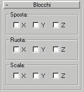 Tendina Blocchi: Con le opzioni comprese nella tendina Blocchi è possibile bloccare la capacità di un oggetto di spostarsi, ruotare o essere scalato intorno ad uno qualsiasi dei propri assi locali.