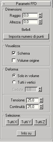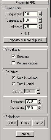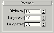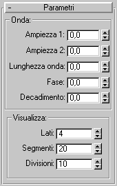 I parametri di creazione per uno space warp basato su modificatore sono identici a quelli di livello Gizmo della versione modificatore oggetto, con l'aggiunta di una tendina Parametri Gizmo nella quale regolare i valori di Lunghezza, Larghezza e Altezza dell'oggetto. È presente inoltre un'area Deformazione, contenente un parametro Decadimento. Se Decadimento è impostato su 0, non c'è alcun decadimento e lo space warp agisce sul proprio oggetto vincolato indipendentemente dalla sua distanza dall'oggetto stesso. Quando si aumenta il valore di Decadimento, l'effetto sull'oggetto vincolato svanisce in modo esponenziale. Per maggiori informazioni, vedere gli argomenti sui singoli space warp.