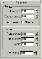 Sistemi particellari: Applica una forza uniforme, unidirezionale in una direzione positiva o negativa. Quando la forza è positiva, si sposta nella direzione del tasto sul jack idraulico. L'ampiezza della forza è infinitamente perpendicolare alla direzione, anche se è possibile limitarla utilizzando l'opzione Intervallo.