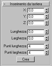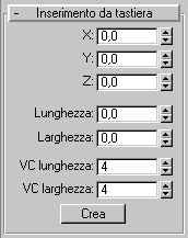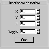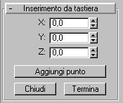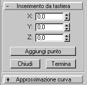 La tendina Inserimento da tastiera consente di creare una curva NURBS tramite l'uso della tastiera. Avvalersi del tasto TAB per spostarsi tra i comandi di questa tendina. Per premere un pulsante, utilizzare INVIO mentre il pulsante è attivo.