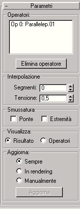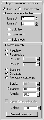I comandi di approssimazione curva appaiono trai parametri di creazione per gli oggetti curva e nella tendina Approssimazione curva per i modelli NURBS (oggetti superficie NURBS, livello superiore). Al livello del modello, i comandi di approssimazione agiscono su tutti i sub-oggetti curva del modello stesso.