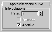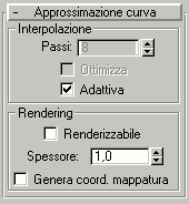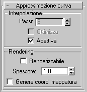 Adattivo: (default) Segmenta la curva in modo adattivo, in base alla curvatura. In altre parole, 3DS MAX assegna alla curva più punti segmento o VC (vertici di controllo) laddove la curvatura è massima, meno punti o VC dove la curvatura è minima.