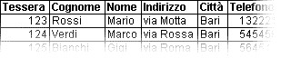I campi sono Tessera, Cognome, Nome, Indirizzo, Città e Telefono. Indicano cosa sarà scritto nelle colonne: sotto il campo Cognome (nella stessa colonna) saranno scritti solo i cognomi delle persone, qualsiasi termine trovato nella colonna sarà interpretato come cognome.